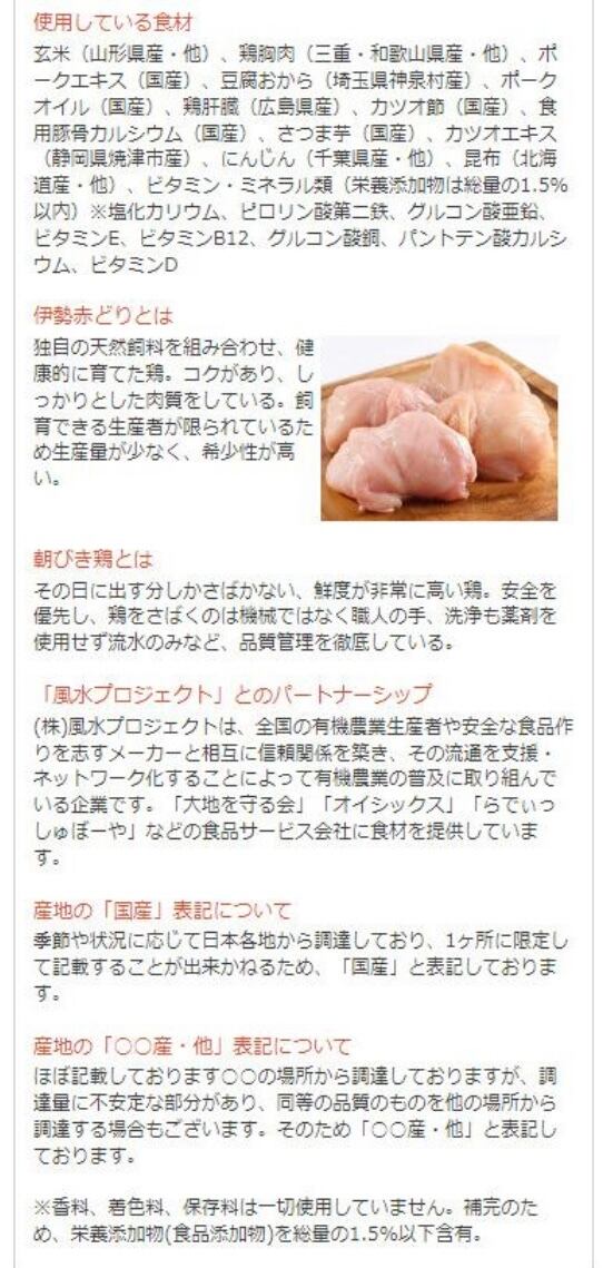 玄米(山形県産・他)、丸麦(国産)、舌平目(瀬戸内海産)、みりん粕(愛知県産)、牛エキス(国産)、カツオ節(国産)、牛オイル(国産)、ビール酵母(国産)、鶏肝臓(広島県産)、豆腐おから(埼玉県神泉村産)、食用牛骨カルシウム(国産)、カツオエキス(静岡県焼津市産)、さつま芋(国産)、にんじん(千葉県産・他)、米油(国産)、昆布(北海道産・他)、ビタミン・ミネラル類(栄養添加物は総量の1.5%以内)※塩化カリウム、ピロリン酸第二鉄、グルコン酸亜鉛、ビタミンE、ビタミンB12、グルコン酸銅、パントテン酸カルシウム、ビタミンD
