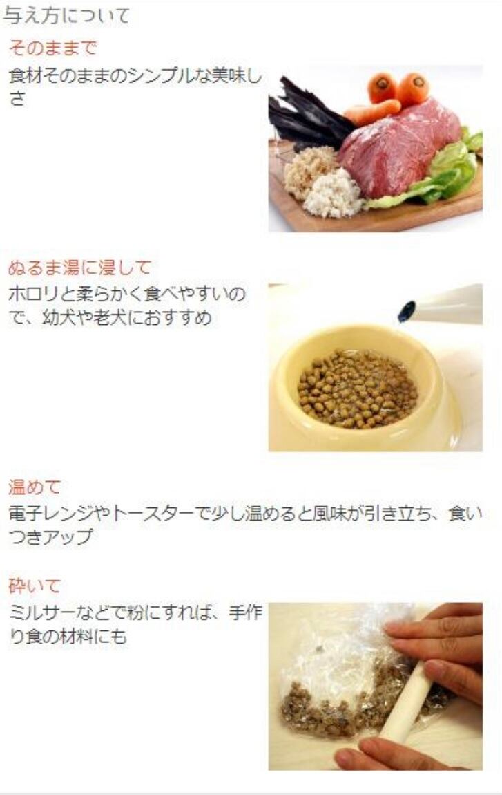 玄米(山形県産・他)、ポークエキス(国産)、白米(福岡県産・他)、豚肉(国産)、ポークオイル(国産)、ビール酵母(国産)、豆腐おから(埼玉県神泉村産)、食用豚骨カルシウム(国産)、カツオエキス(静岡県焼津市産)、豚肝臓(国産)、カツオ節(国産)、鶏卵(国産)、にんじん(千葉県産・他)、かぼちゃ(国産)、菜種油(オーストラリア産・遺伝子組換えでない)、昆布(北海道産・他)、ビタミン・ミネラル類(栄養添加物は総量の1.5%以内)※塩化カリウム、ピロリン酸第二鉄、グルコン酸亜鉛、ビタミンE、ビタミンB12、グルコン酸銅、パントテン酸カルシウム、ビタミンD