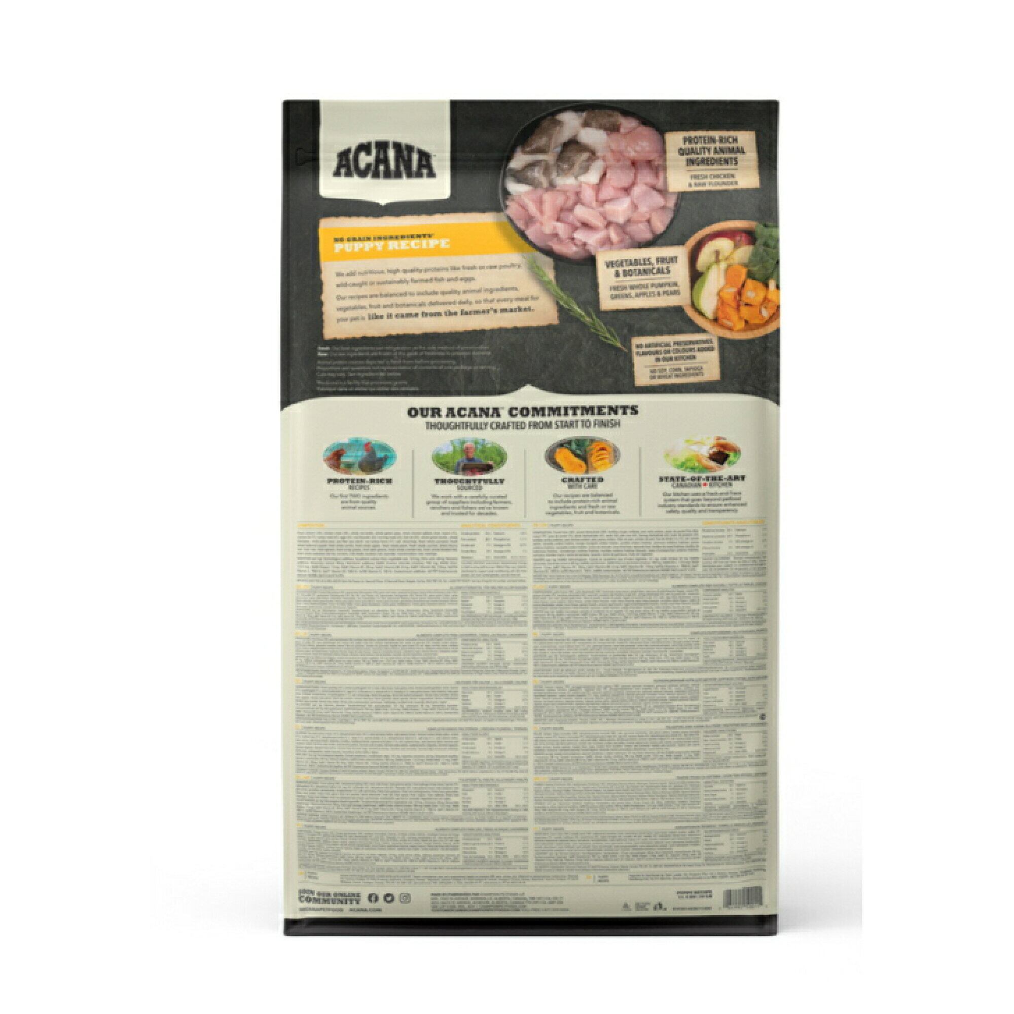 地元草原農場産の放し飼い鶏肉と巣に産み落とされた卵、ノースバンクーバー島産天然カレイを豊富に使用、子犬の最高の健康状態へ導く栄養が豊富です。すべて新鮮な状態で搬送されています。