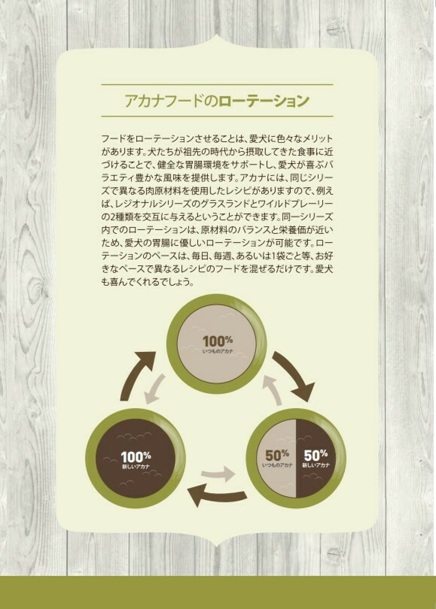 保証成分 粗たんぱく質 31%以上、脂肪分 15%以上、粗繊維 5%以下、粗灰分 7.5%以下、水分 12%以下、カルシウム / リン 1.3%以上 /0.9%以上 オメガ 6 / オメガ 3 2.2%以上 / 0.8%以上、グルコサミン 1200mg/kg以上、コンドロイチン 1000mg/kg以上 カロリー配分 代謝エネルギーは3393kcal/kg(250 ml カップ1杯につき407kcal)、うち32%がたんぱく質、38%が脂肪、30%がフルーツ、野菜由来。