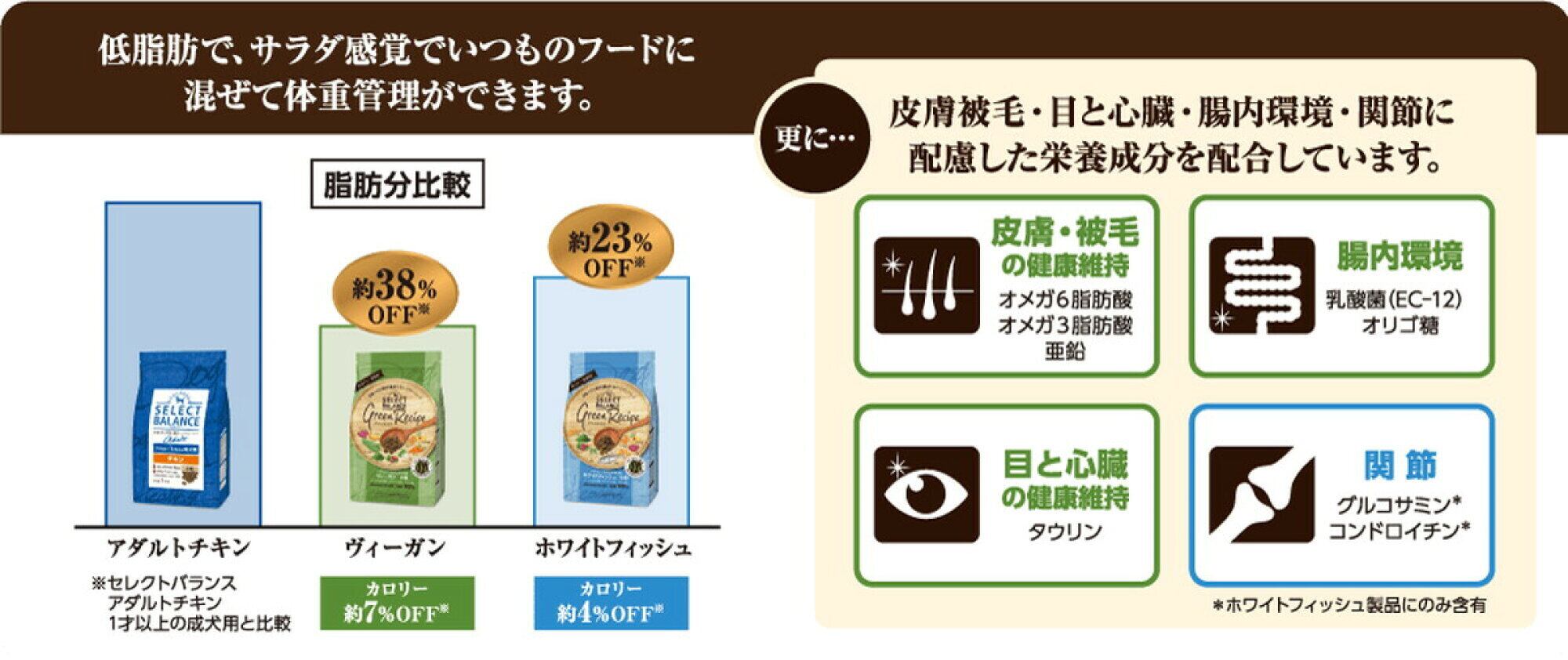 セレクトバランス グリーンレシピは、チキンやビーフなどの肉類の原料を使用せず、植物由来の豆類・野菜・果物の栄養素を活かしたミートフリーフードです。
