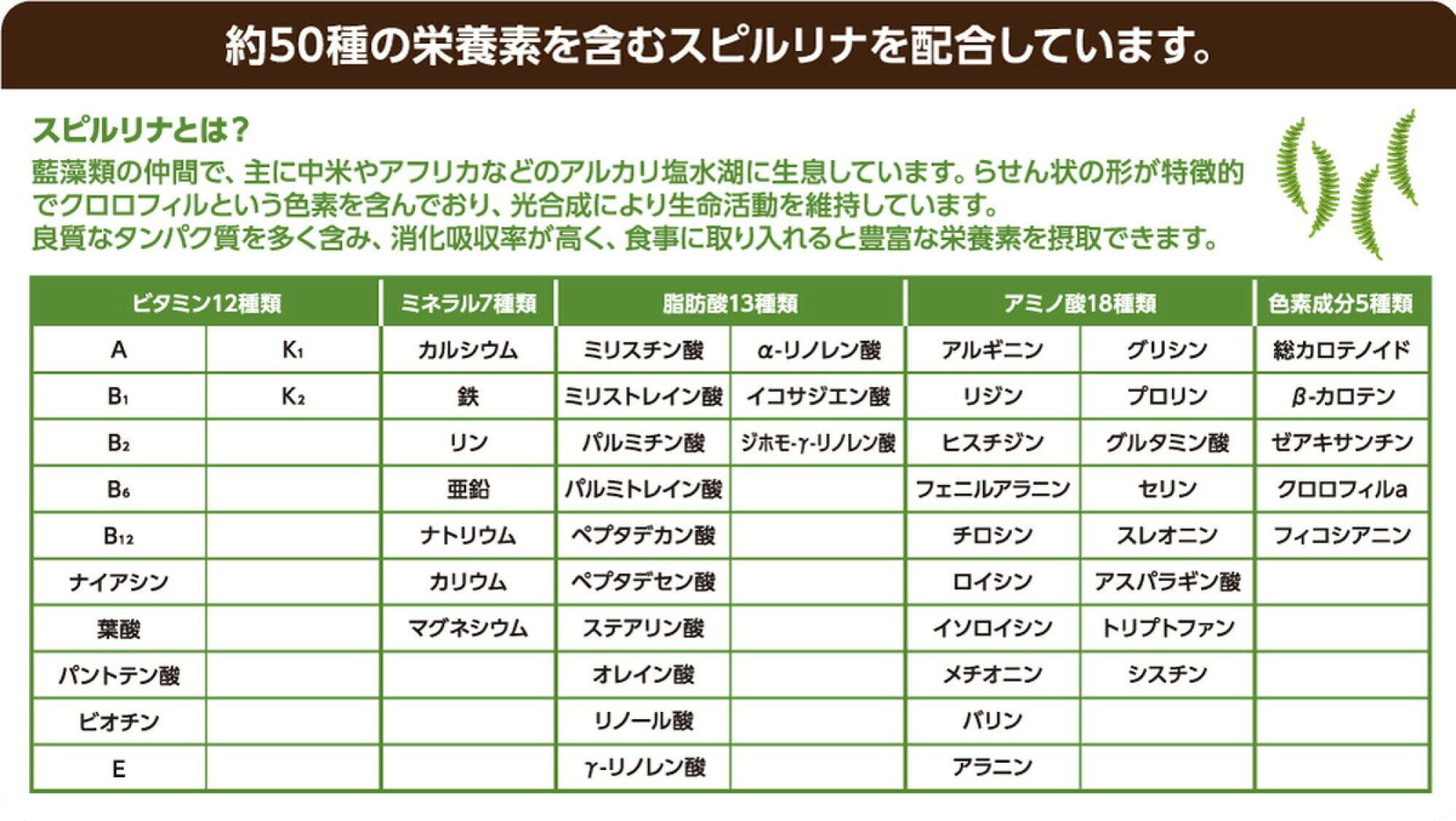 原材料 エンドウ豆、ひよこ豆、エン麦、大麦、サツマイモ、ポテトプロテイン、ビートパルプ、植物油、亜麻仁(オメガ6脂肪酸・オメガ3脂肪酸源)、エンドウ豆プロテイン、ひまわり油(オメガ6脂肪酸源)、酵母エキス、バナナ、アルファルファ、ニンジン、スピルリナ、タンポポ、オオバコ、オリゴ糖、パン酵母(セレン源)、クランベリー、L-カルニチン、乳酸菌(EC-12)、コエンザイムQ10