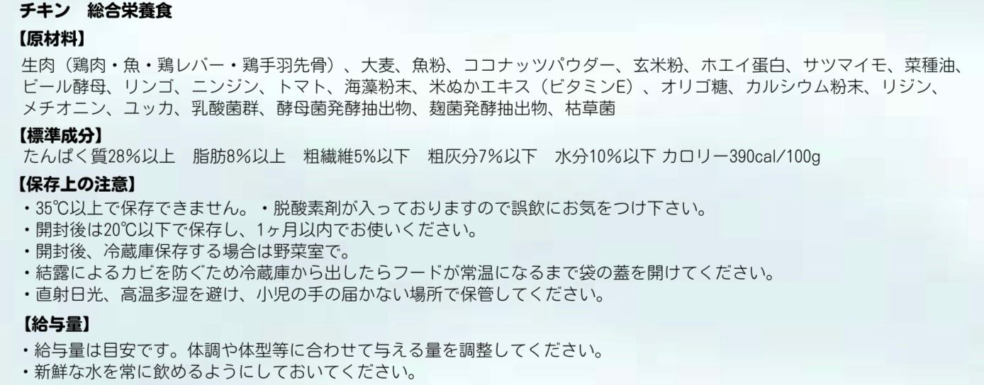 たんぱく質28%以上脂肪8%以上粗繊維5%以下粗灰分7%以下水分10%以下 カロリー390Kcal/100g