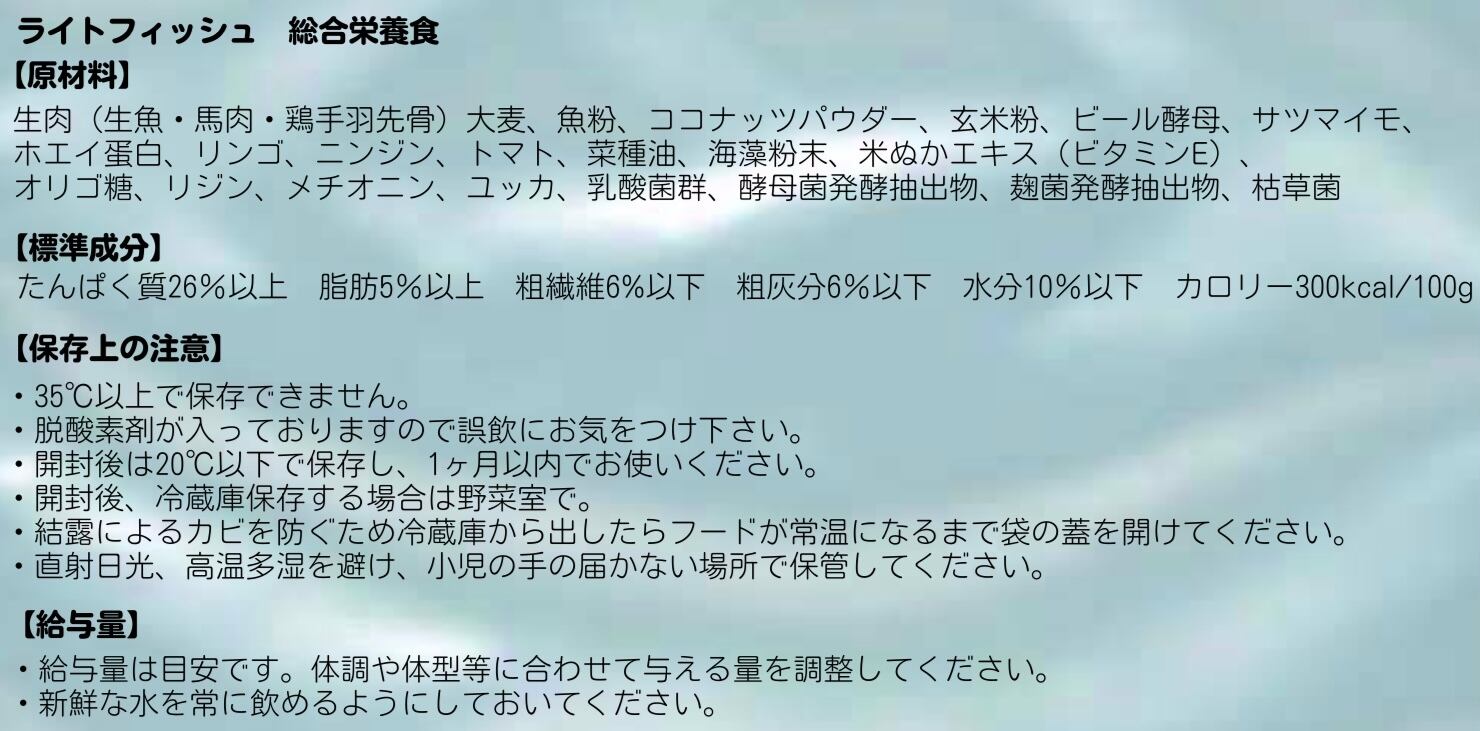 生肉(魚・馬肉・鶏手羽先骨)大麦、魚粉、ココナッツパウダー、玄米粉、ビール酵母、サツマイモ、ホエイ蛋白、リンゴ、ニンジン、トマト、菜種油、海藻粉末、米ぬかエキス(ビタミンE)、オリゴ糖、リジン、メチオニン、ユッカ、乳酸菌群、酵母菌発酵抽出物、麹菌発酵抽出物、枯草菌